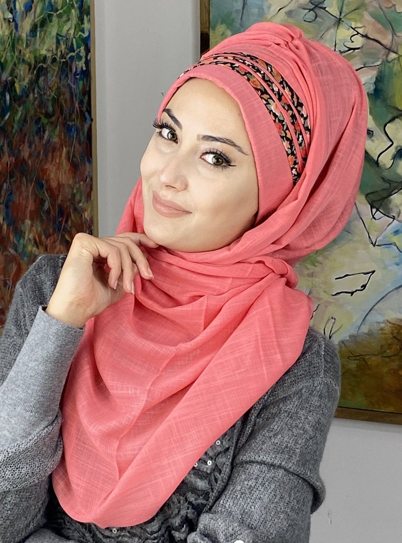BUTİK AMBAR Yavruağzı Asimetrik Turuncu Çiçekli Drapeli Hazır Şal