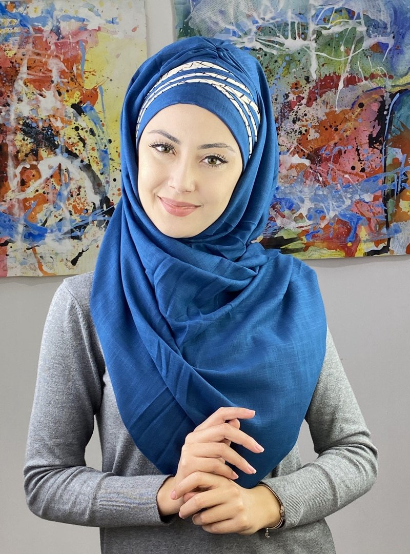 BUTİK AMBAR Mavi Kısa Çizgili Çapraz Drapeli Şal