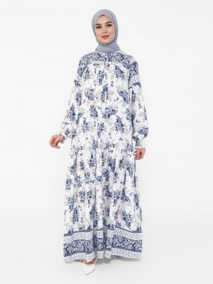 Tavin Mavi Doğal Kumaşlı Çiçek Desenli Elbise
