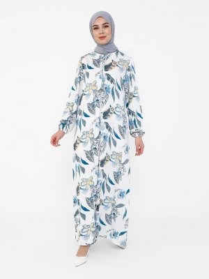 Tavin Turkuaz Doğal Kumaşlı Çiçek Desenli Elbise