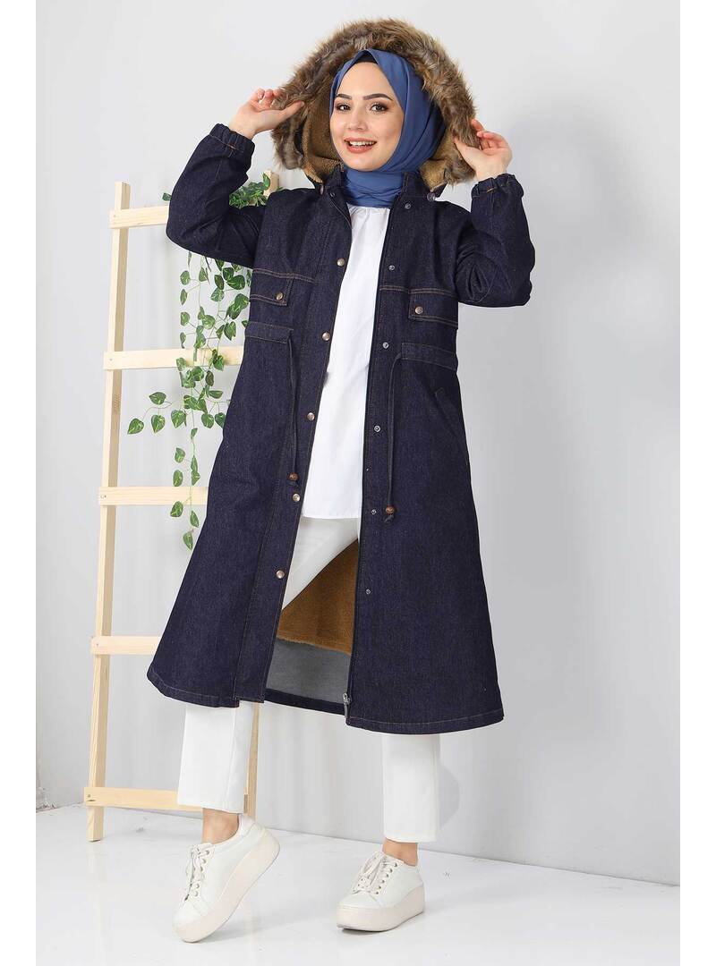 Tesettür Dünyası Lacivert İçi Kürklü Kot Mont