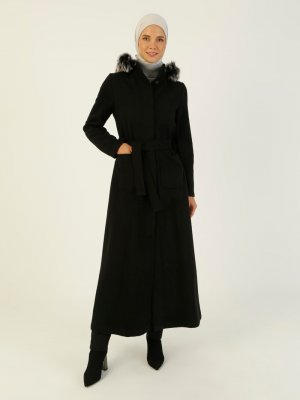 Miss Cazibe Siyah Kapüşonu Kürk Detaylı Manto