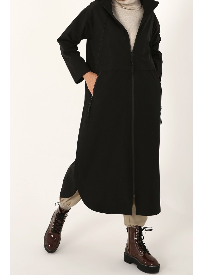 Allday Siyah Kapüşonlu Cepli Fermuarlı Trençkot