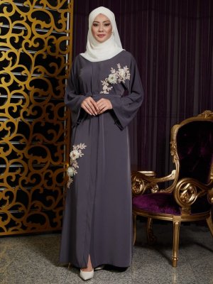 İz Otantik Gri Aplike Detaylı Abaya Abiye Ferace