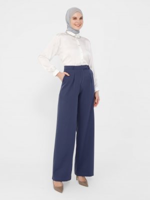 Refka Lacivert Pileli Bol Paça Klasik Pantolon