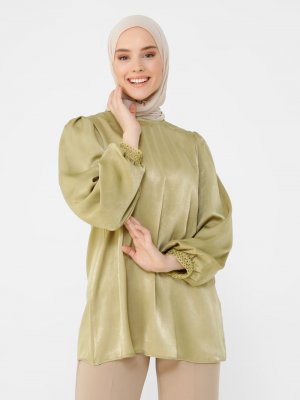 Refka Yağ Yeşili Kol Uçları Güpürlü Şık Bluz