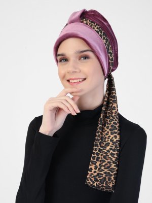 Sevda Bone Gül Kurusu Kadife Şallı Şapkalı Hazır Türban