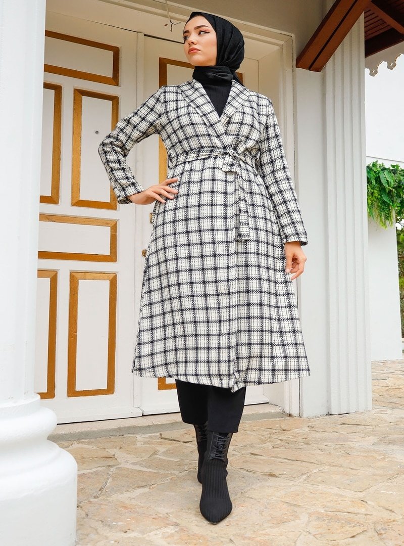 In Style Ekru Ekoseli Kuşaklı Uzun Tüvit Kap