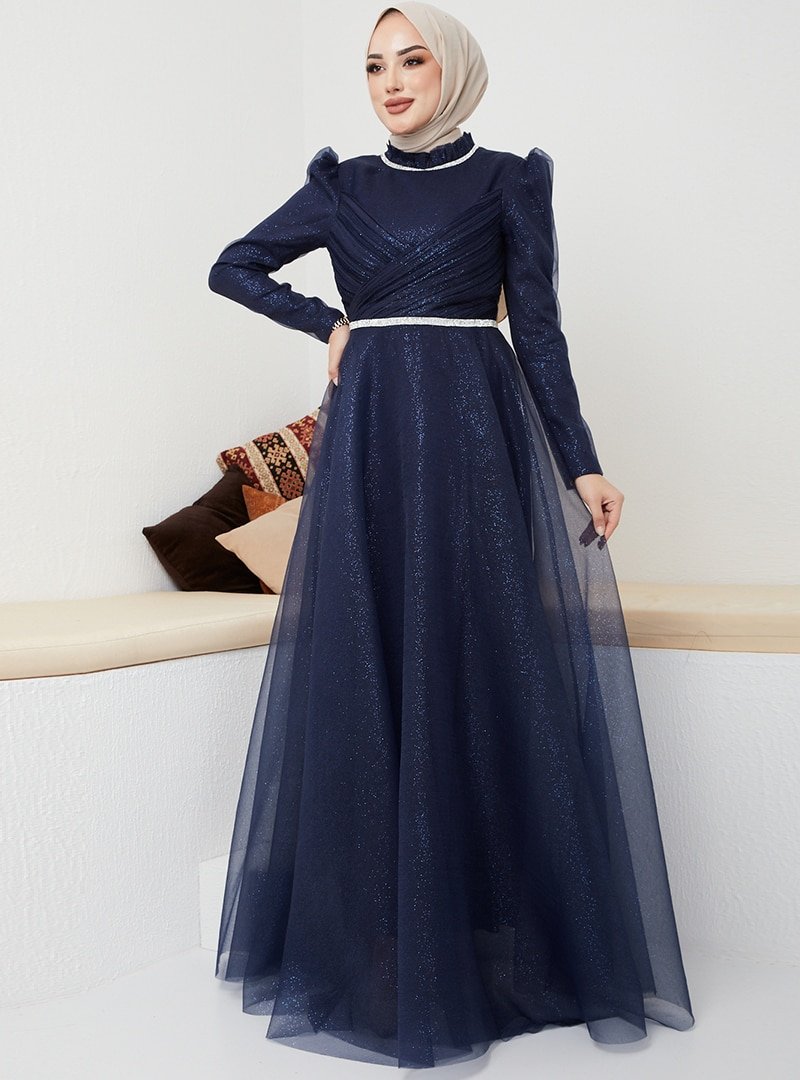 Olcay Lacivert Göğsü Pileli Taş Şerit Detaylı Simli Abiye Elbise