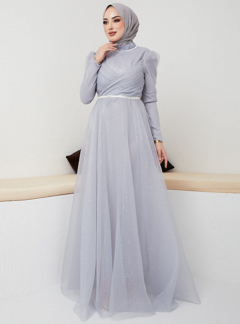 Olcay Açık Gri Göğsü Pileli Taş Şerit Detaylı Simli Abiye Elbise
