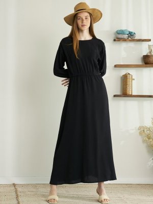 SoftandBasic Siyah Büzgülü Dokuma Elbise