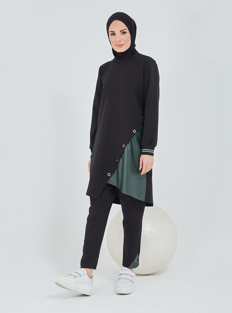 AİŞE MODA Siyah Deri Detaylı Spor Tunik & Pantolon İkili Takım