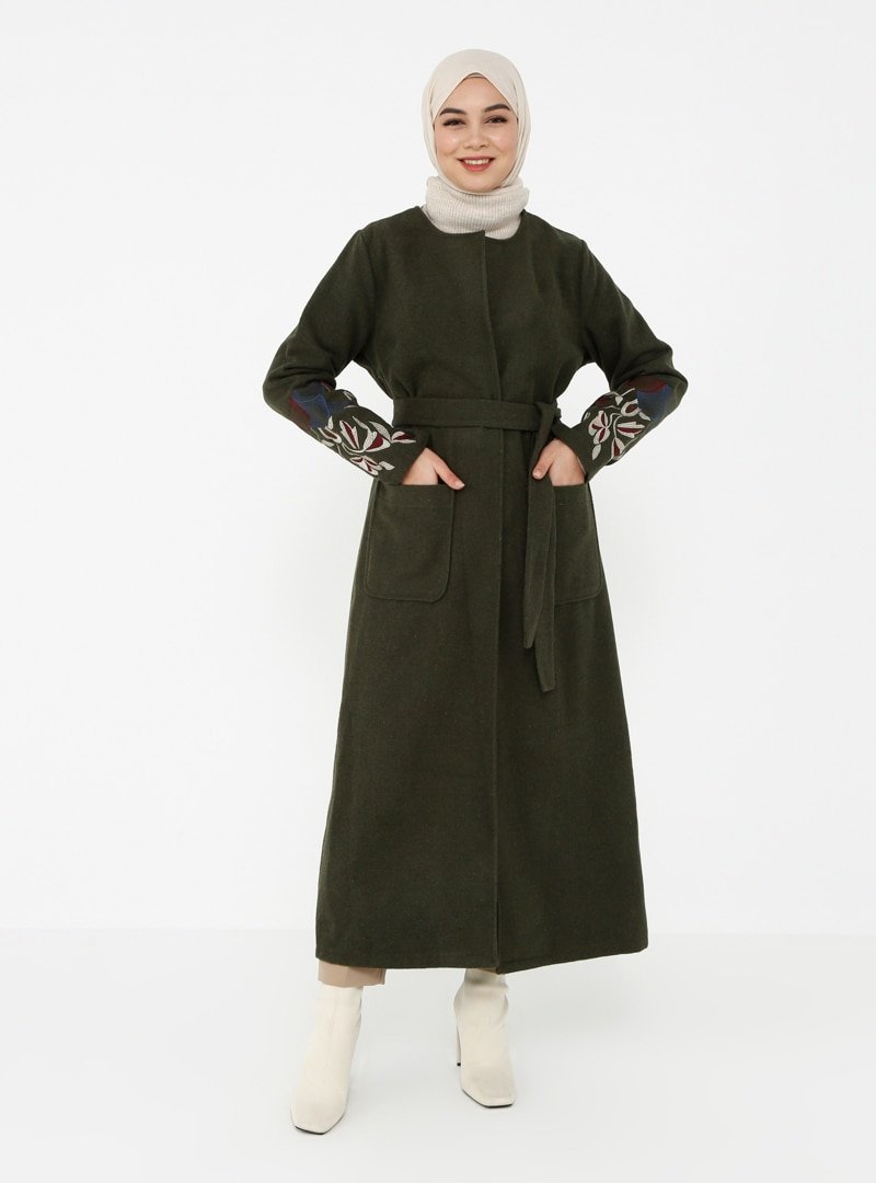 Tavin Haki Kol Ucu Nakış Detaylı Cepli Kemerli Kaban