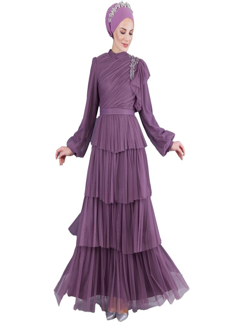 Moda Echer Lila Güpürlü Kat Kat Etekli Tül Abiye Elbise