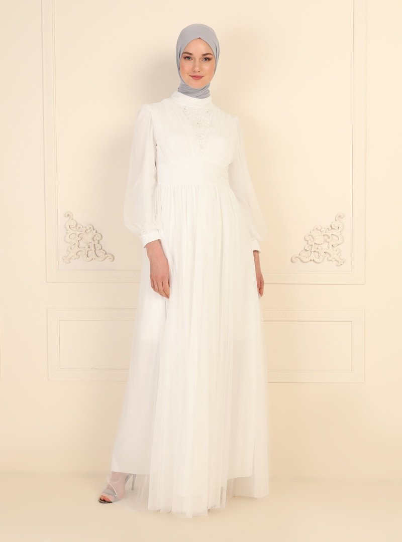 MODAYSA Ekru Tül Ve Aplik Detaylı Abiye Elbise