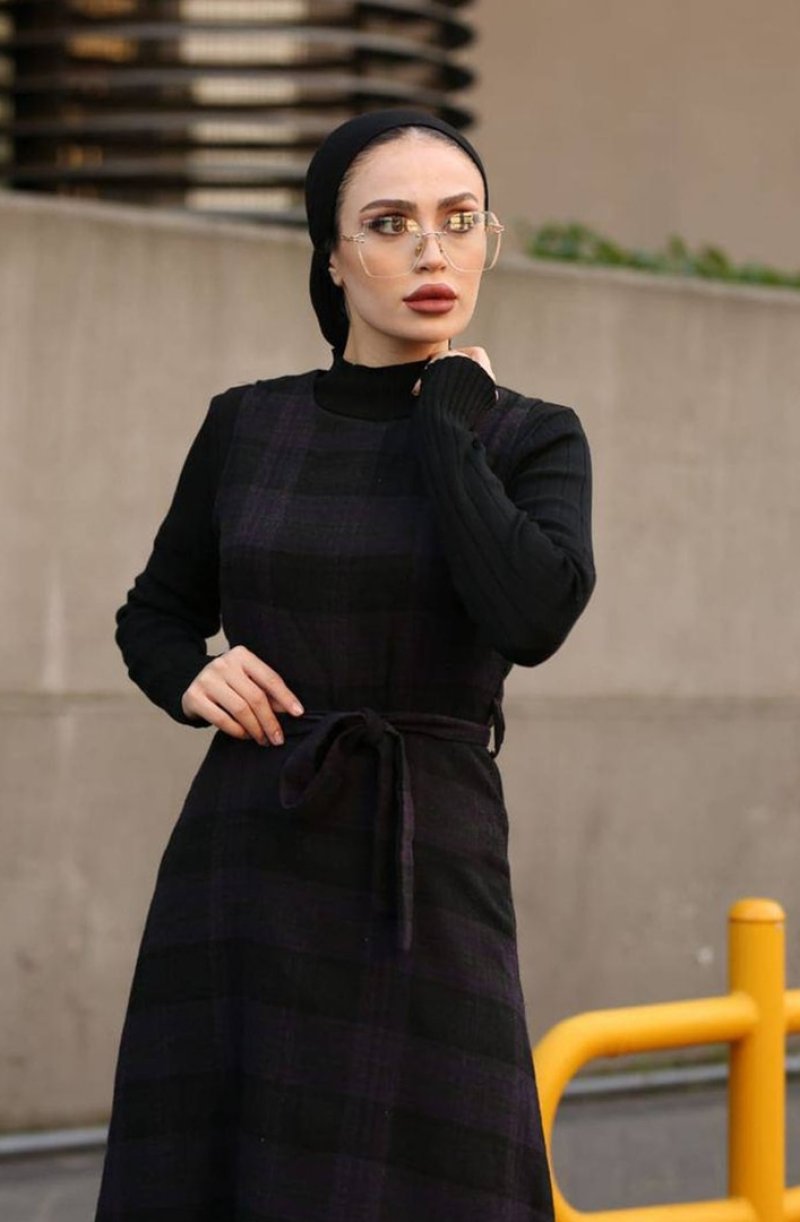 In Style Siyah Mürdüm Ekose Desenli Kuşaklı Jile