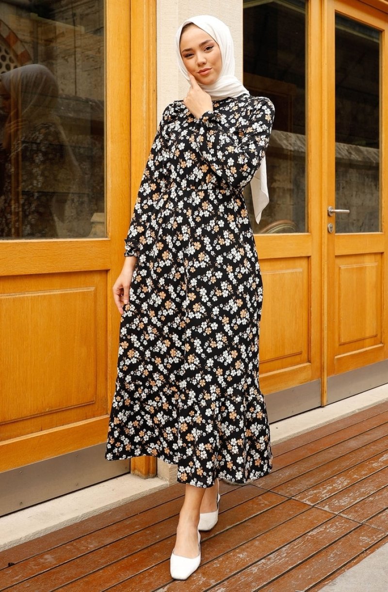 In Style Siyah Fırfır Detaylı Çiçek Desen Elbise
