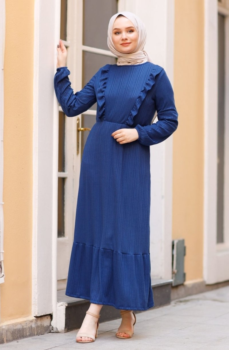In Style İndigo Eteği Ve Ön Kısmı Fırfır Detaylı Elbise