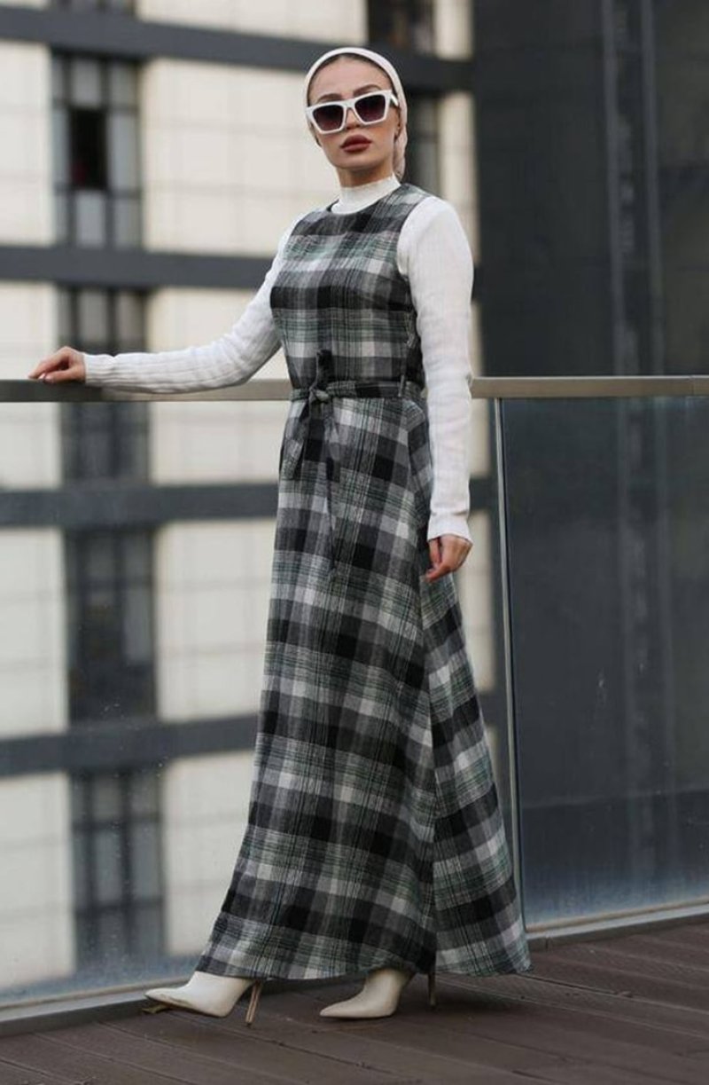 In Style Antrasit Yeşil Ekose Desenli Kuşaklı Jile