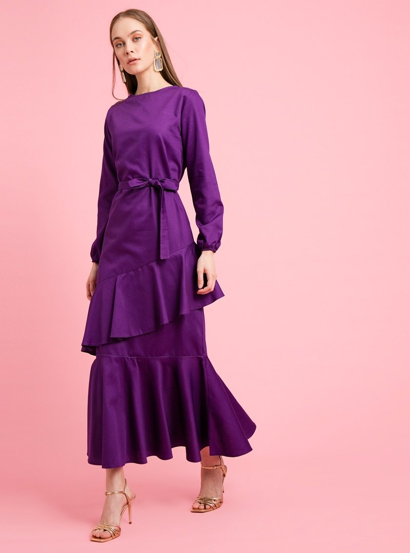 Ceylan Otantik Mor Çift Volanlı Elbise