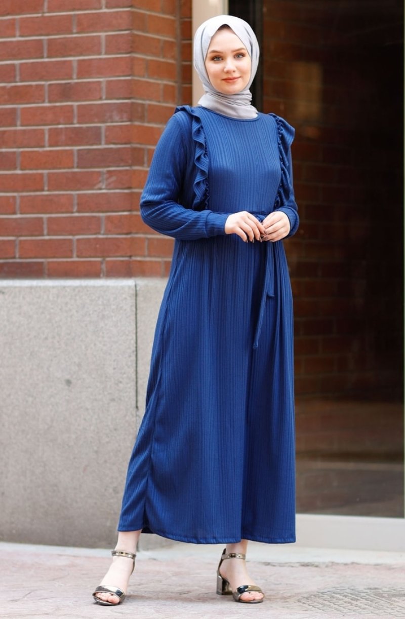 In Style İndigo Fırfır Detay Kuşaklı Elbise