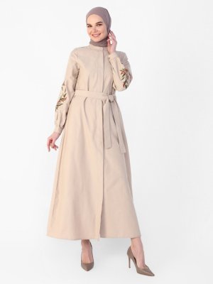 Refka Açık Vizon Kolları Nakışlı Poplin Elbise