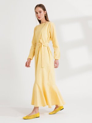 Ceylan Otantik Sarı Pötikare Volanlı Elbise