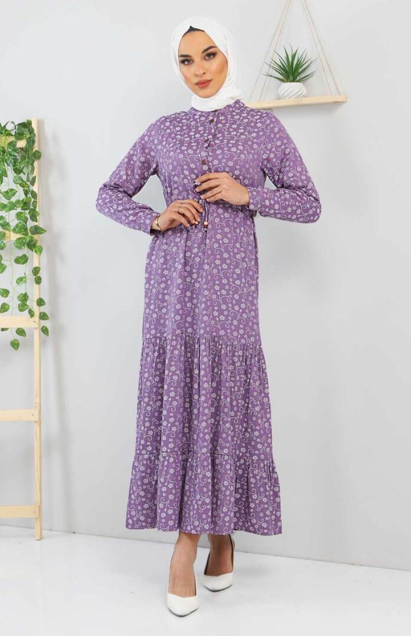 Tesettür Dünyası Mor Çiçek Desenli Elbise