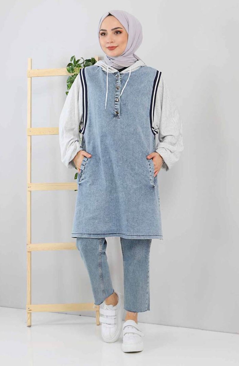Tesettür Dünyası Açık Mavi Kot Detaylı Tunik