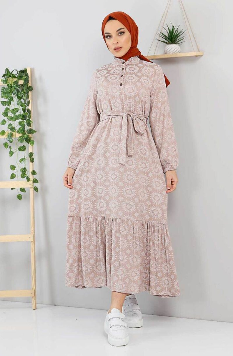 Tesettür Dünyası Vizon Beli Bağlamalı Desenli Elbise
