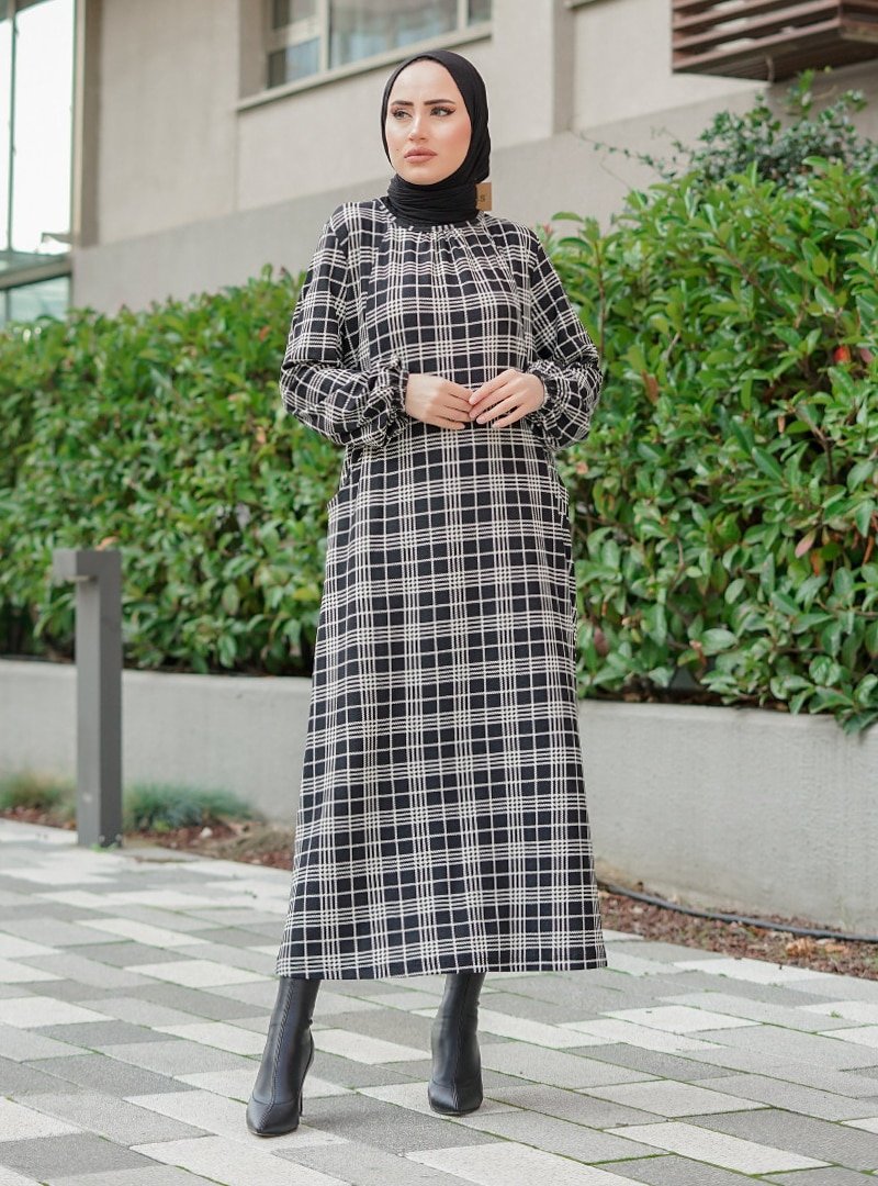 Topless Siyah Beyaz Kare Desenli Elbise