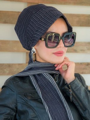 AİŞE TESETTÜR Lacivert Çizgili Atkılı Şapka