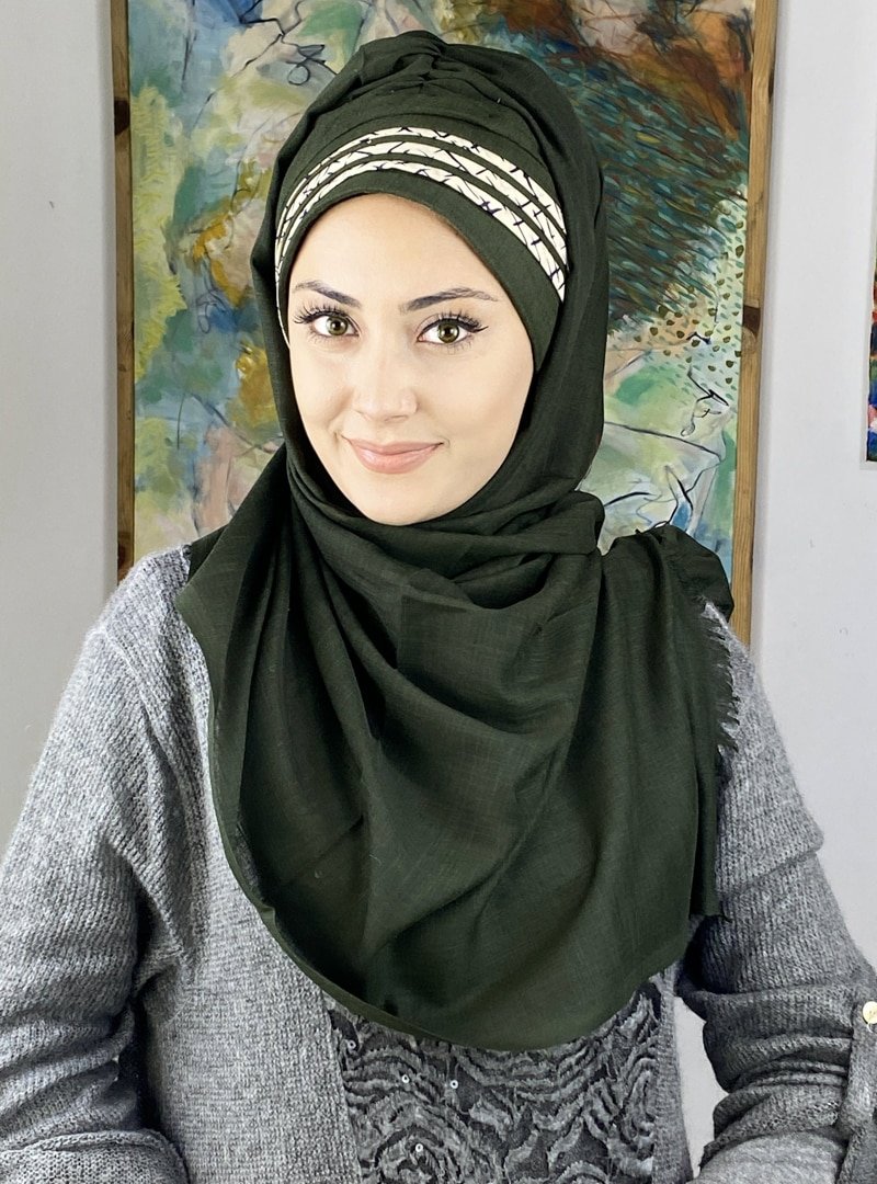 BUTİK AMBAR Koyu Yeşil Asimetrik Krem Drapeli Hazır Şal
