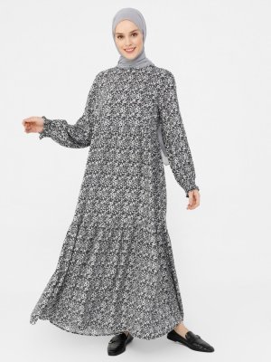 Refka Siyah Desenli Etek Kısmı Volanlı Viskon Elbise