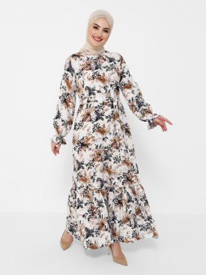 Tavin Ekru Doğal Kumaşlı Kuşaklı Çiçek Desenli Elbise