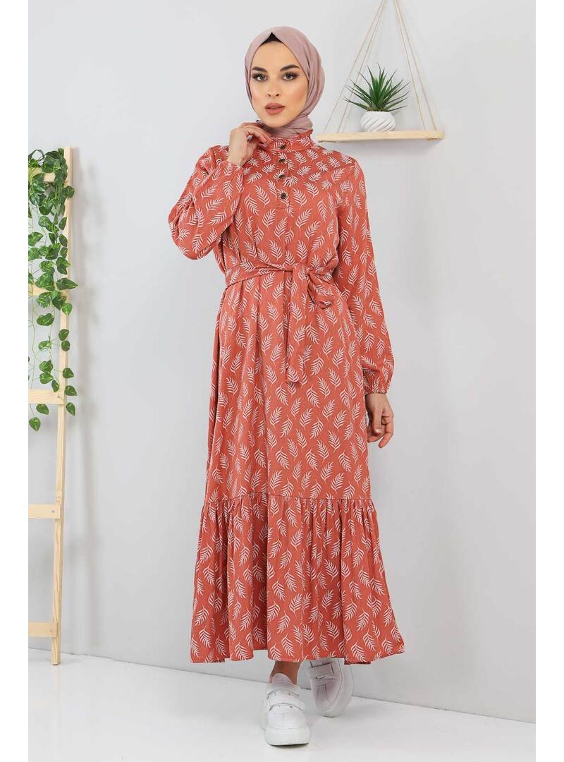 Tesettür Dünyası Somon Beli Bağlamalı Yaprak Desenli Elbise