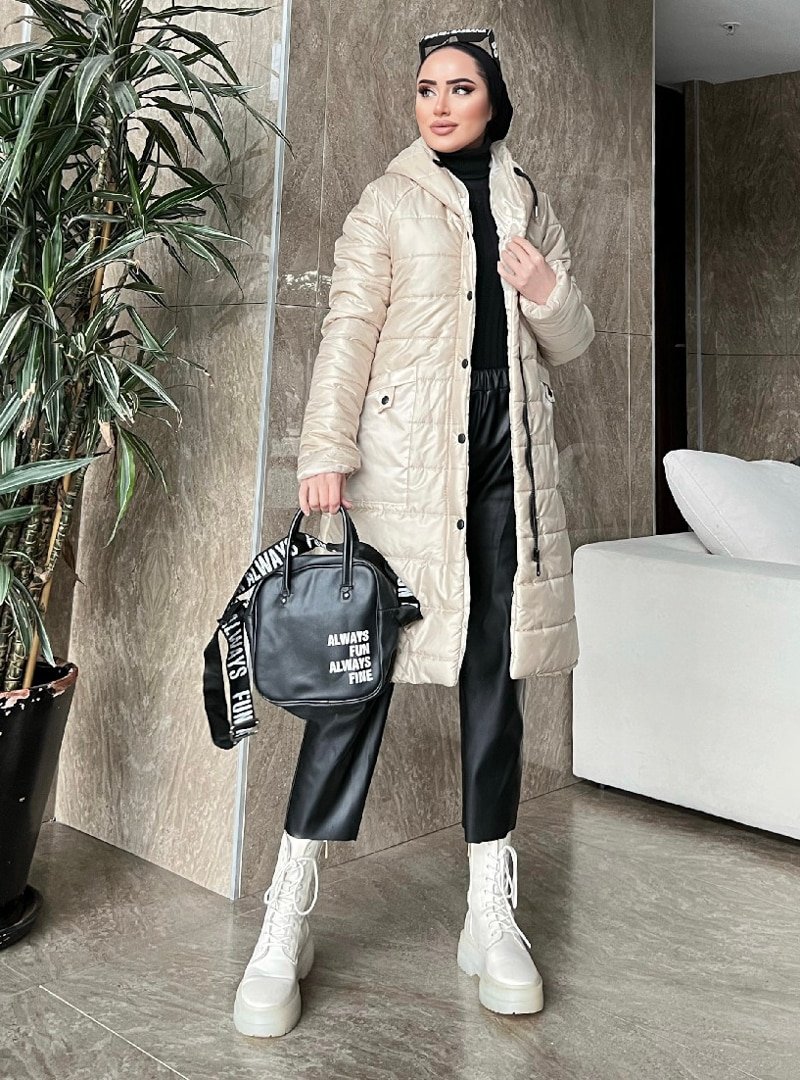Topless Bej Kapüşonlu Şişme Uzun Mont