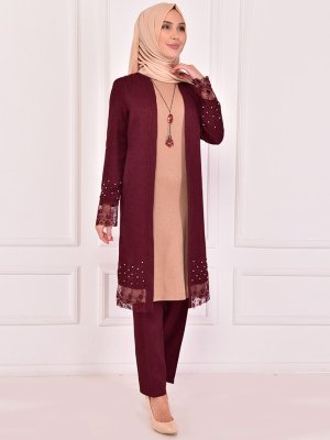 AYŞE MELEK TASARIM Bordo İncili Dantel Detaylı İkili Abiye Takım