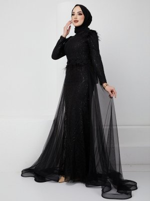 Olcay Siyah Tüy Ve İnci Detaylı Tül Etekli Dantel Abiye Elbise