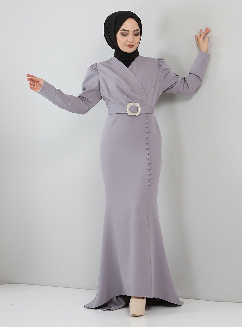 MISSVALLE Gri Düğme Detaylı Abiye Elbise