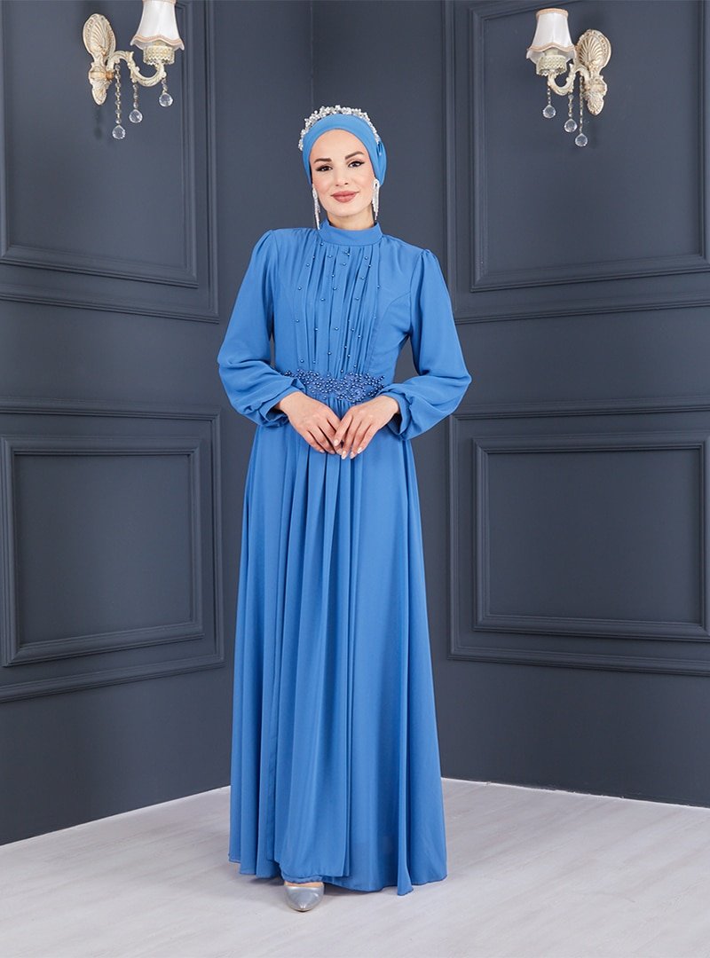 Moda Echer İndigo İnci Detaylı Güpür İşlemeli Abiye Elbise