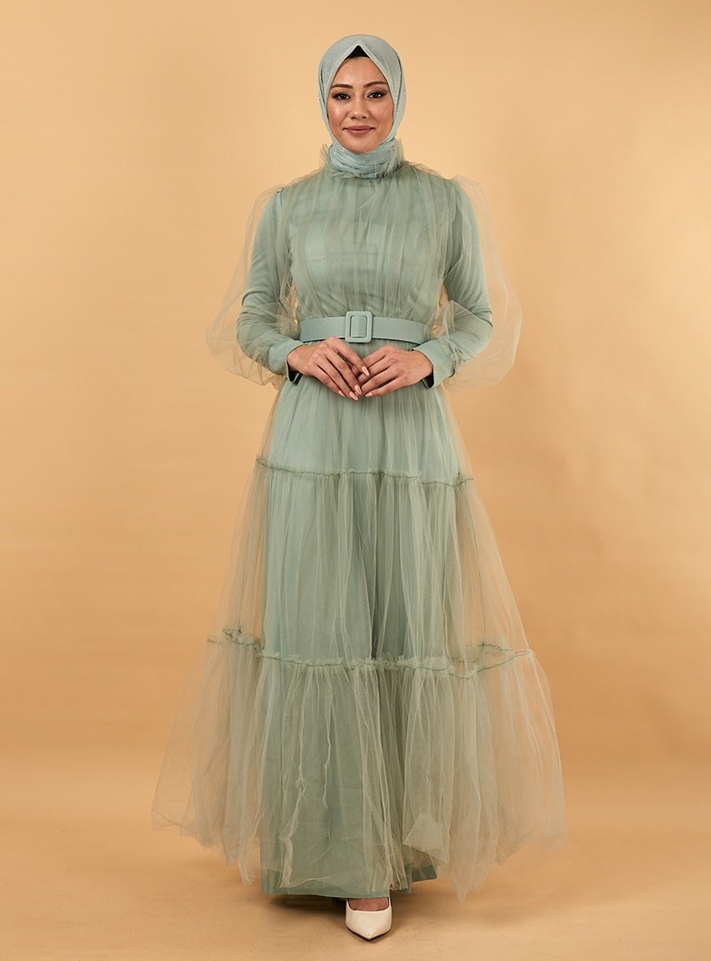 TESETTURİUM Mint Balon Kollu Tül Abiye Elbise