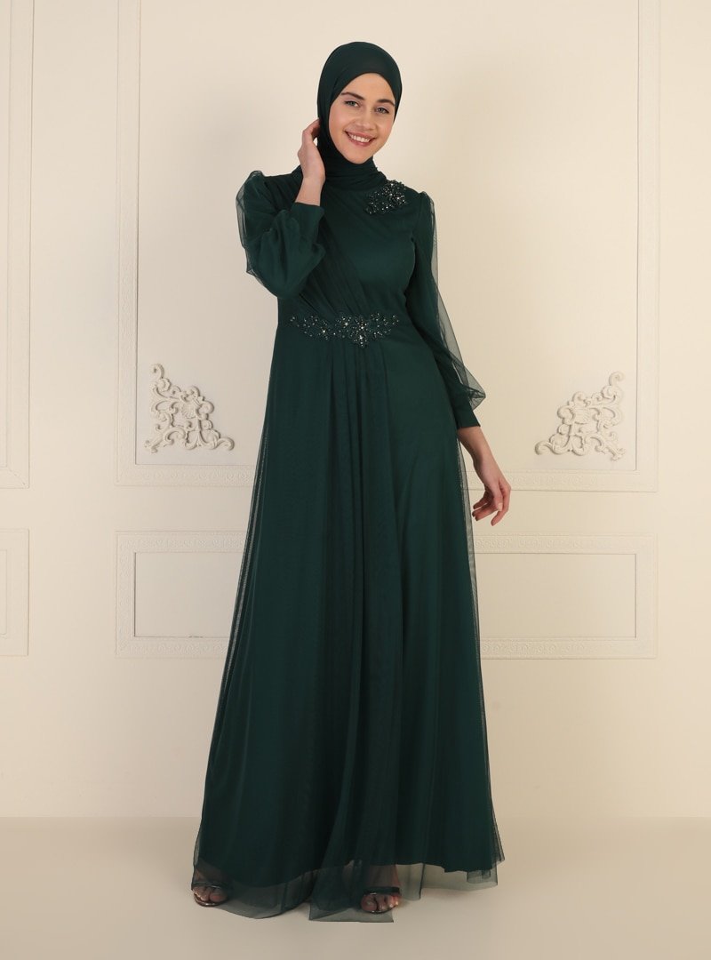MODAYSA Zümrüt Yeşili Helen Tül Detaylı Abiye Elbise