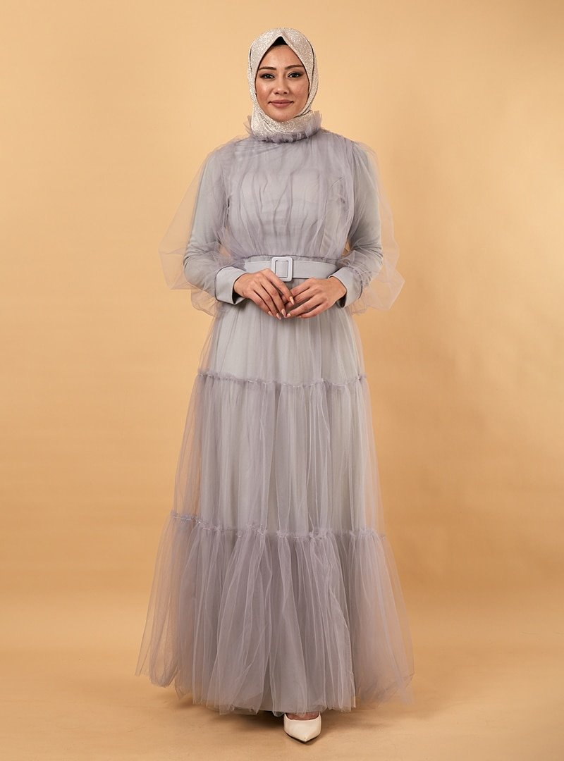TESETTURİUM Gri Balon Kollu Tül Abiye Elbise