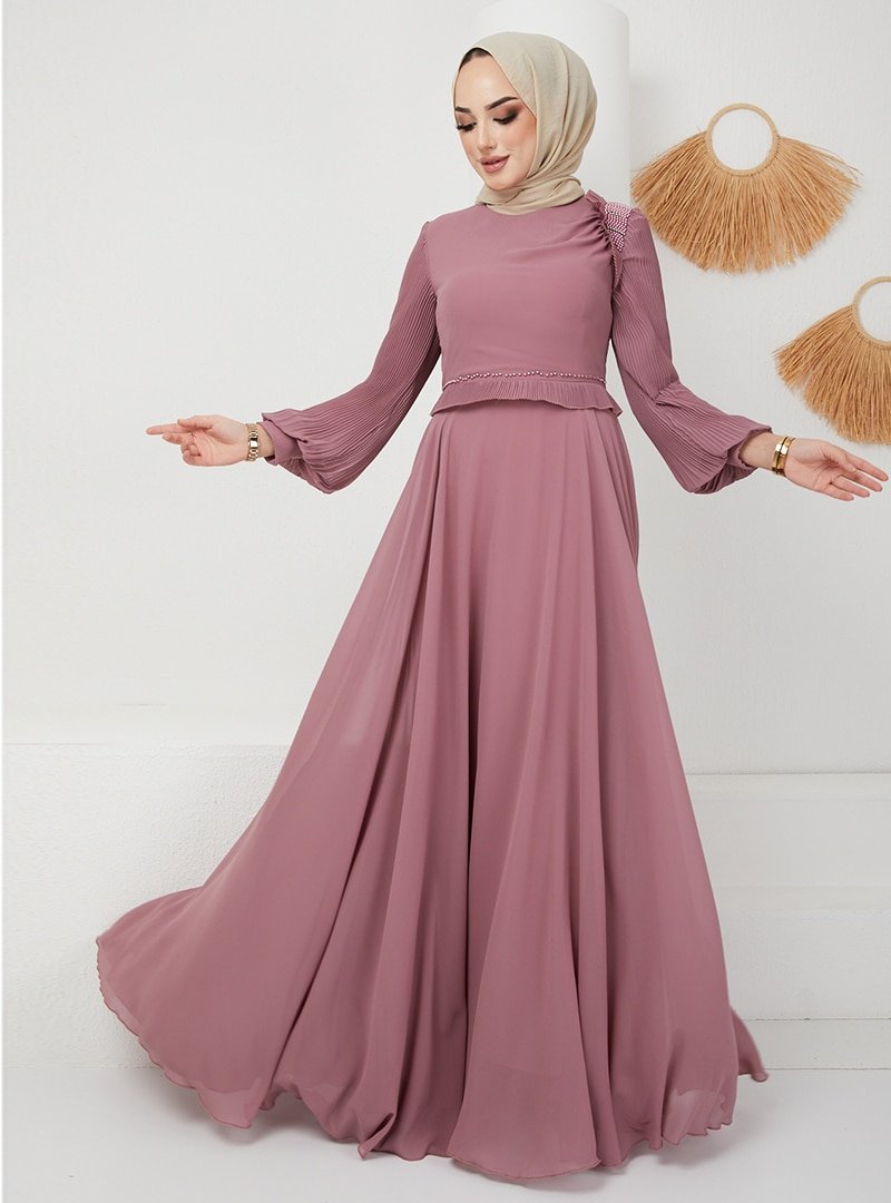 Olcay Gül Fırfır Ve İnci Detaylı Kolu Piliseli Abiye Elbise