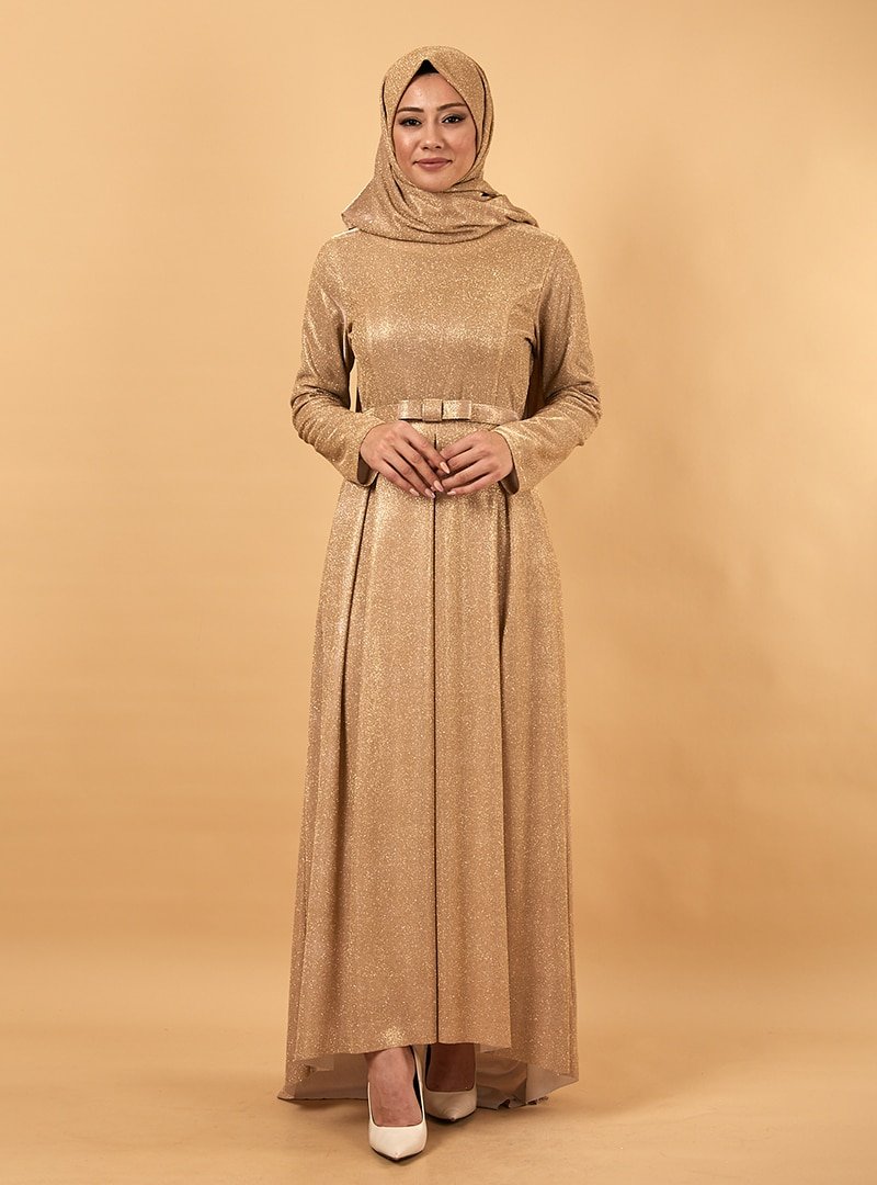 TESETTURİUM Gold Işıltılı Pile Abiye Elbise