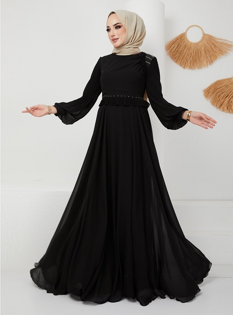 Olcay Siyah Fırfır Ve İnci Detaylı Kolu Piliseli Abiye Elbise
