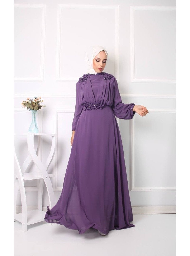 Moda Echer Lila Belde Ve Omuzda Çiçek Detaylı Abiye Elbise