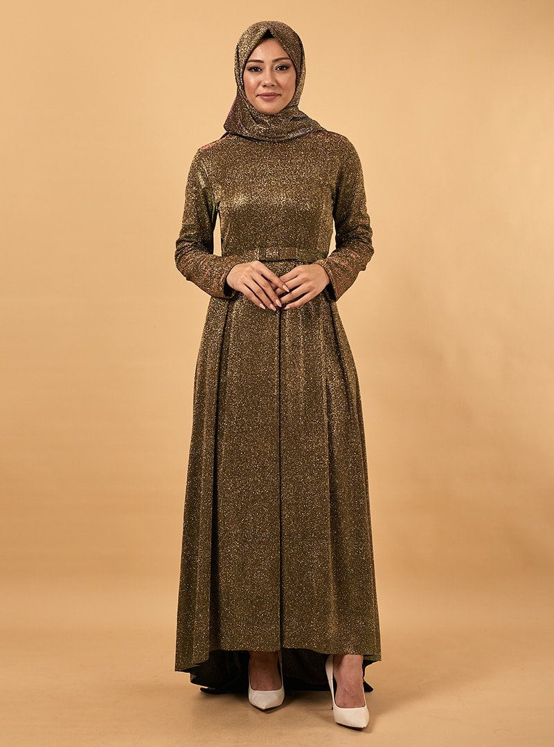 TESETTURİUM Haki Işıltılı Pile Abiye Elbise