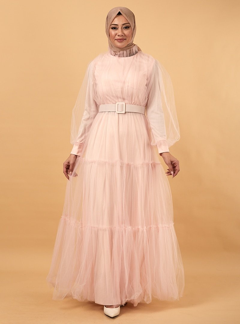 TESETTURİUM Pudra Balon Kollu Tül Abiye Elbise